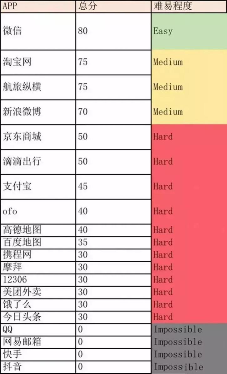 此前南方都市报测试了二十款左右的APP,对其注销难易程度做了评级,测评显示,在二十款APP中,注销难度最低的是微信,而从淘宝、航旅纵横、新浪微博到京东、滴滴、支付宝、ofo等APP的注销难度依次上升,最难注销的则是近来大火的抖音、快手以及国民级社交软件QQ和邮箱APP网易邮箱。